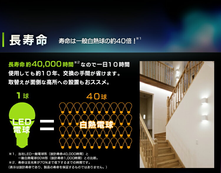 5年保証で長寿命約40000時間の、ランプ交換の手間が少ないLED電球です。